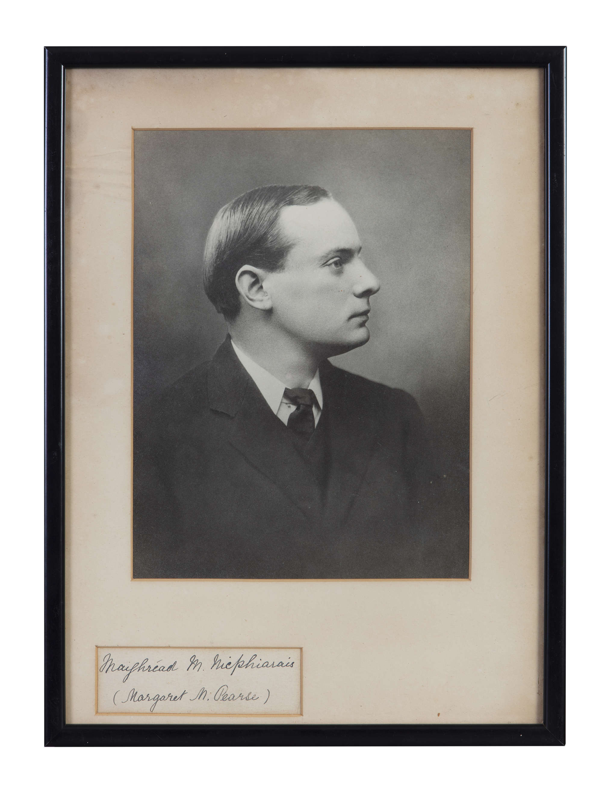 A PORTRAIT PHOTOGRAPH OF PATRICK PEARSE, c.1910, from the Lafayette Studio, Dublin, signed off the print by Margaret Pearse. 25 x 19cm