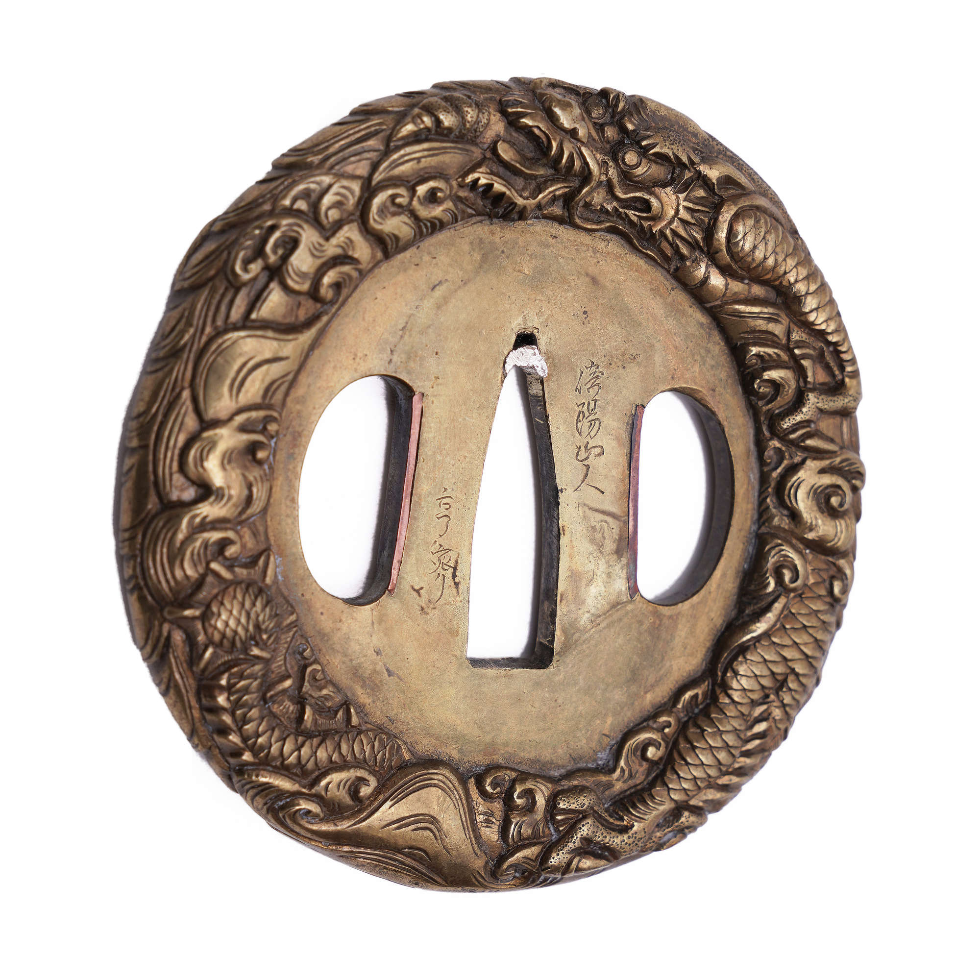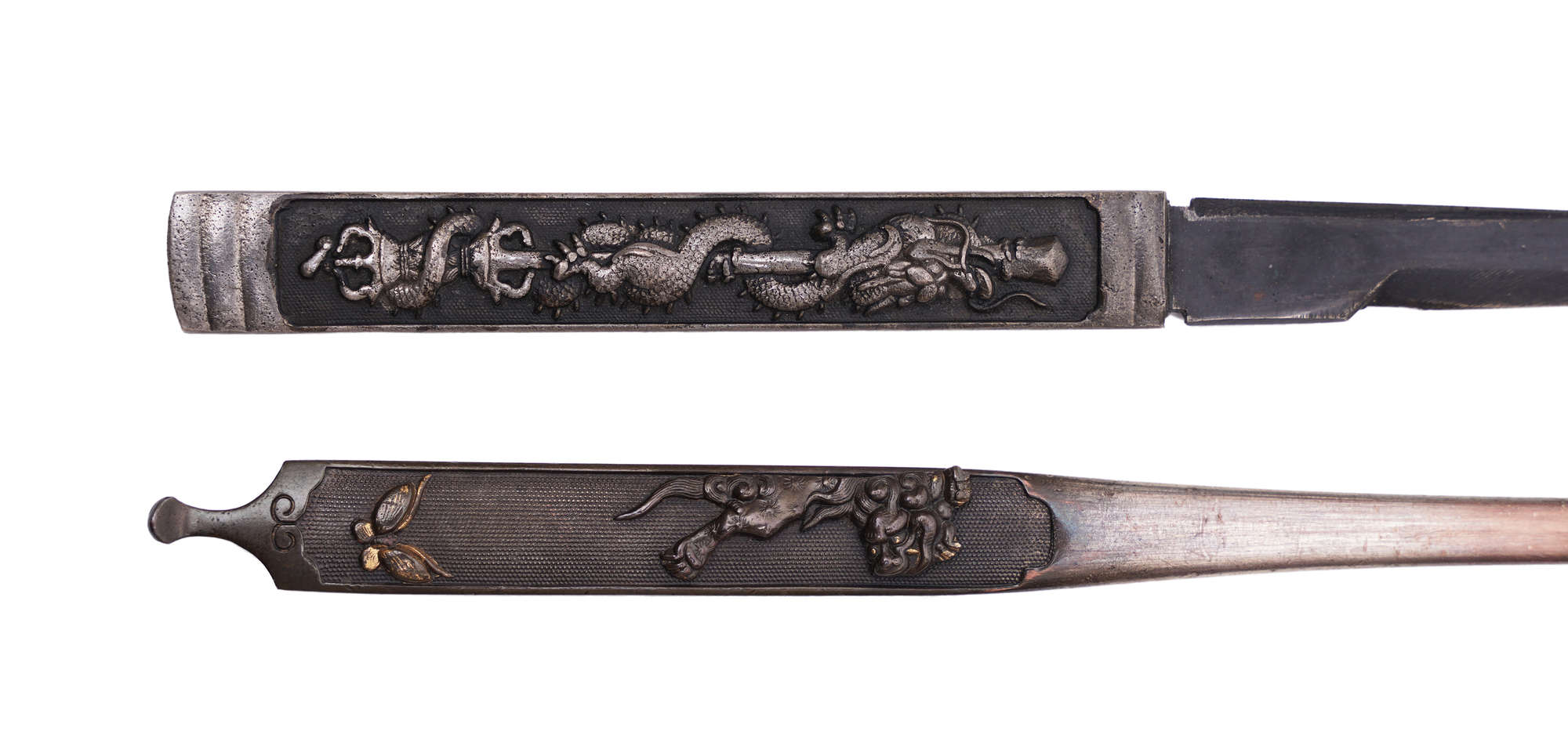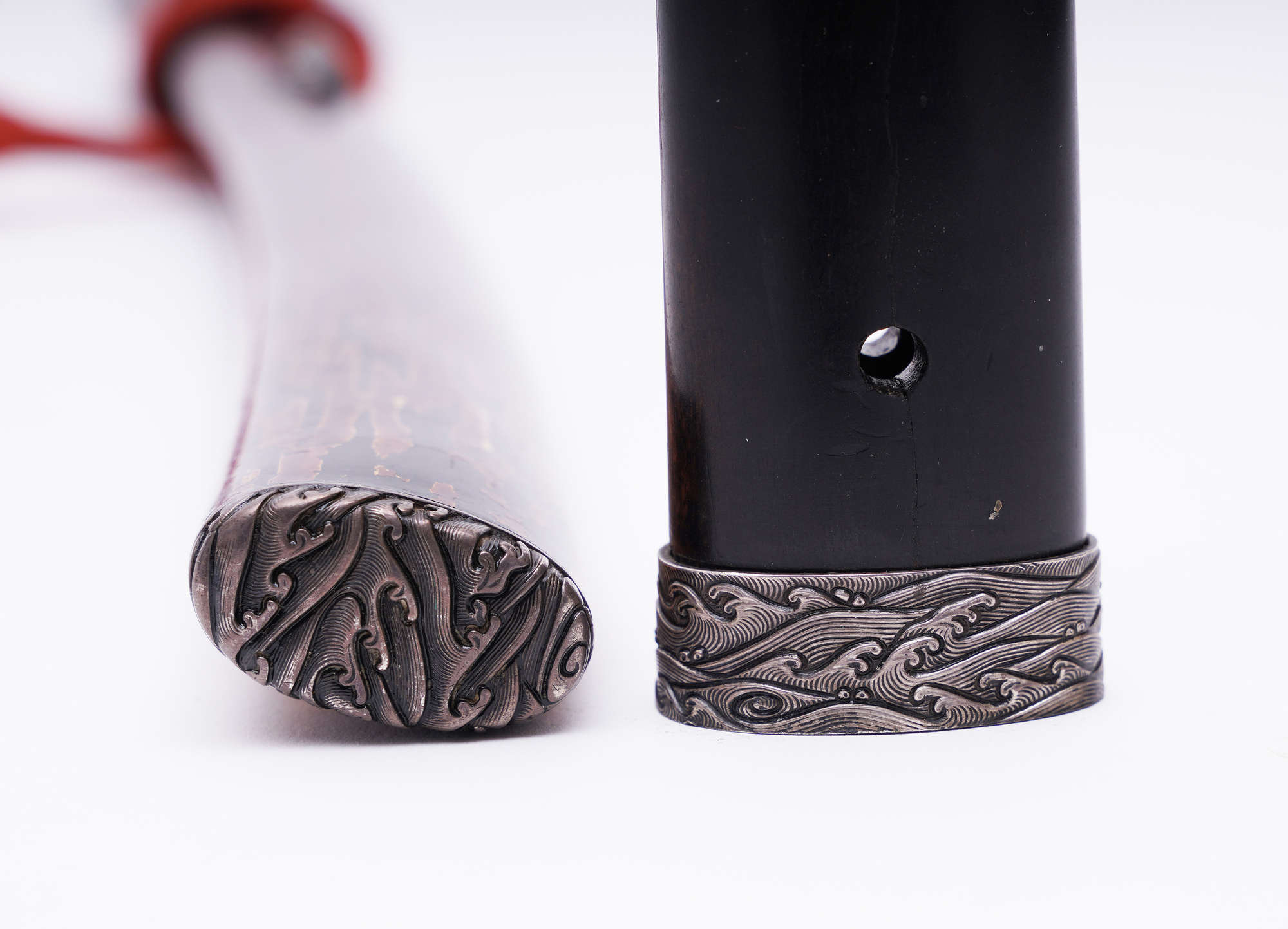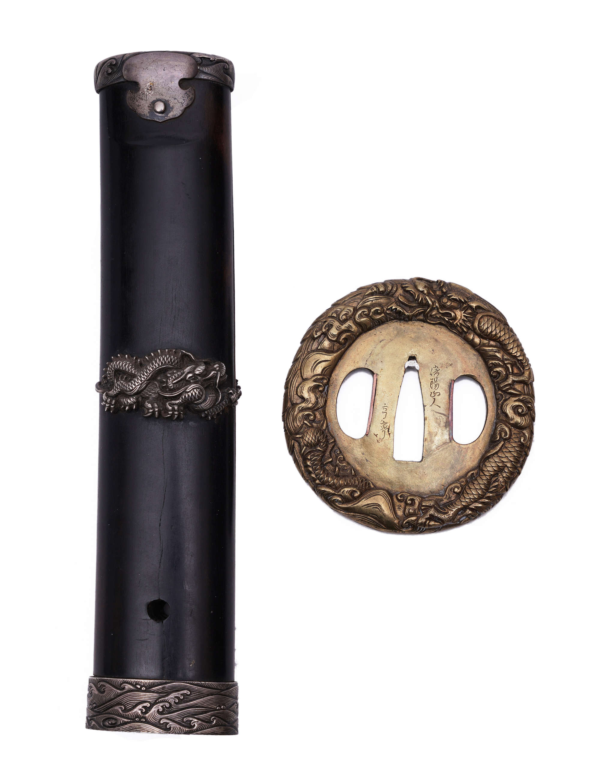 The koshirae is of soroimono type (all the pieces are en suite) with a ryu pattern and in the style of nishigaki, with descending waves. The fuchi kashira, menuki, kuchi gane, kogai and kozuka, kojiri and soritsuno are made of silver. The tsuba is made of silvered copper with a ryu pattern and with a hitsu and a kogai hitsu. It is signed in cursive script, i.e. shosho. The saya is lacquered togidashi hyomon. The tsuka is made up of precious wood / shitan. The menuki are of hanashi menuki type (with no braid). The habaki is of niju habaki type (double).