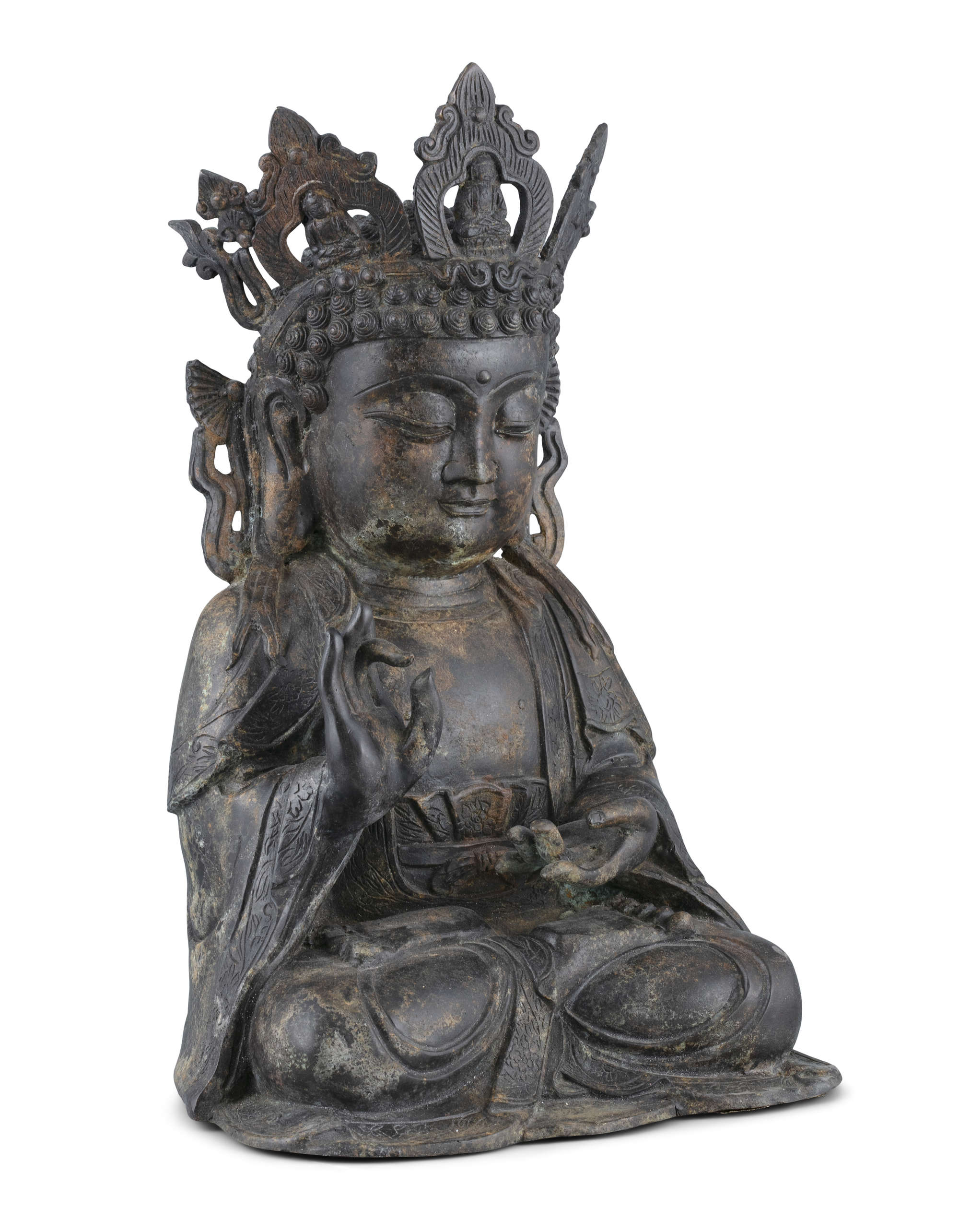 Heavy-casted, with no sealed plaque to the base, with a dark patina and gilt lacquer remains. The Buddha is depicted seated in padmasana, the right hand in abhaya mudra, the left hand in varada mudra, wearing loose robes, with a crowned head.