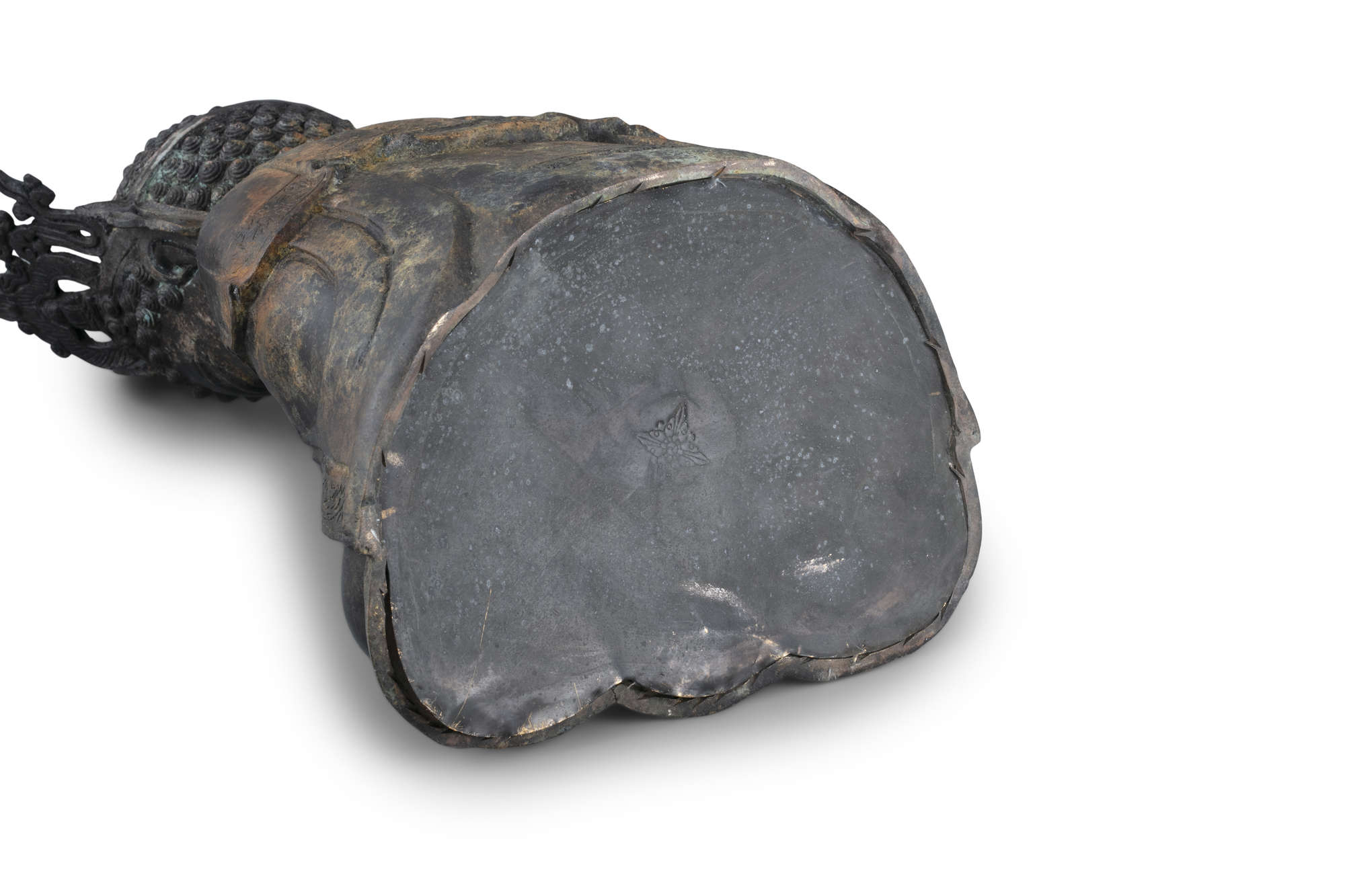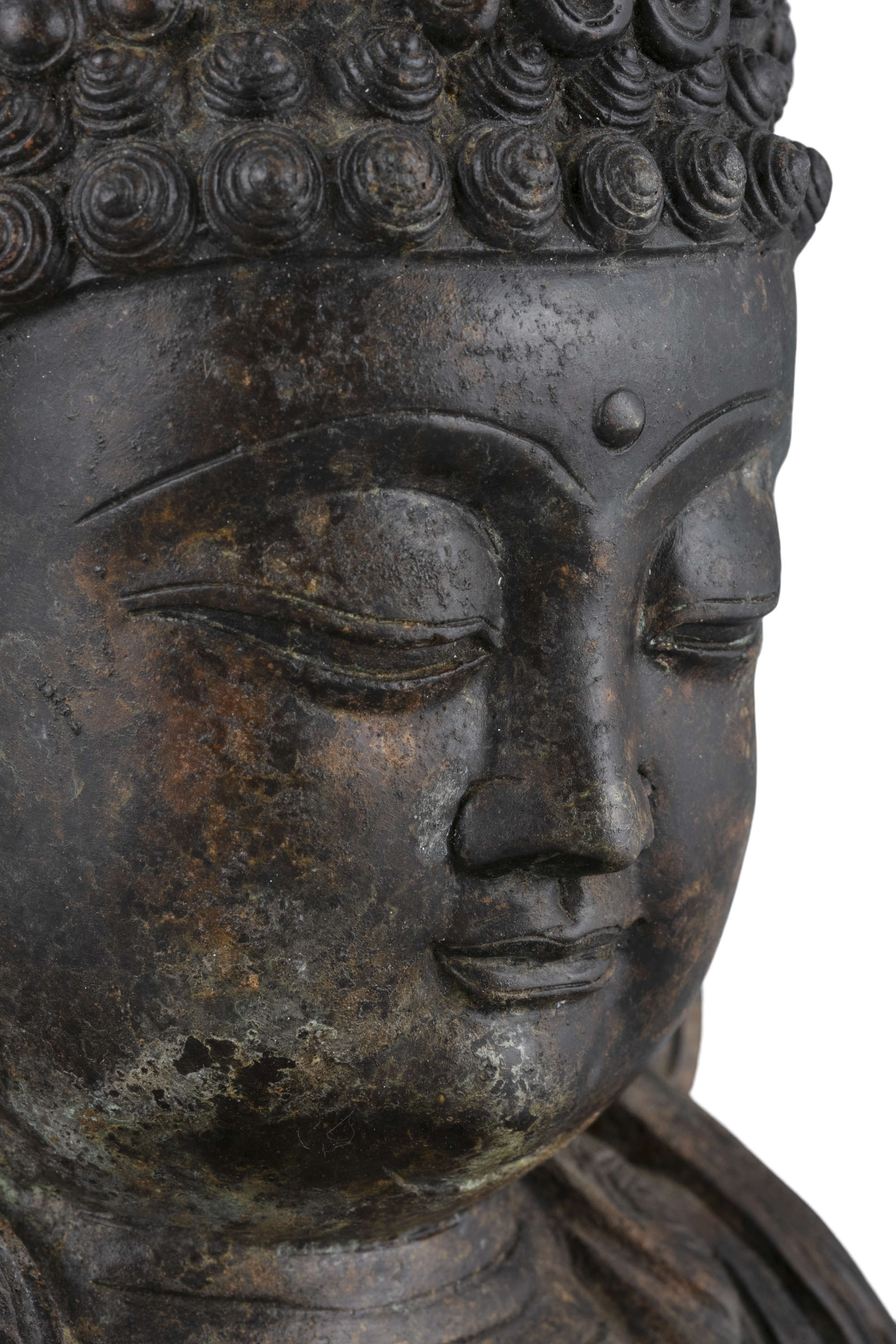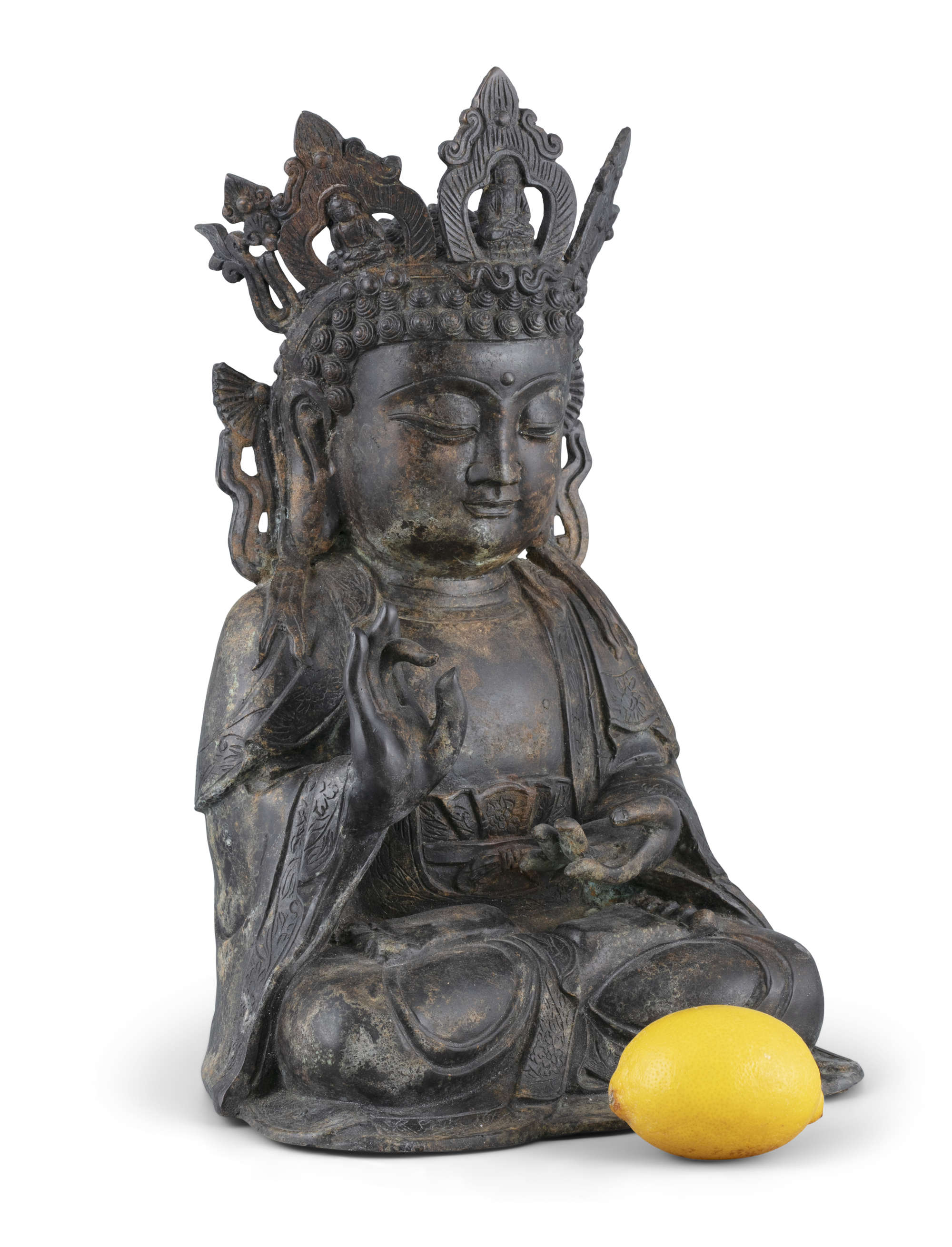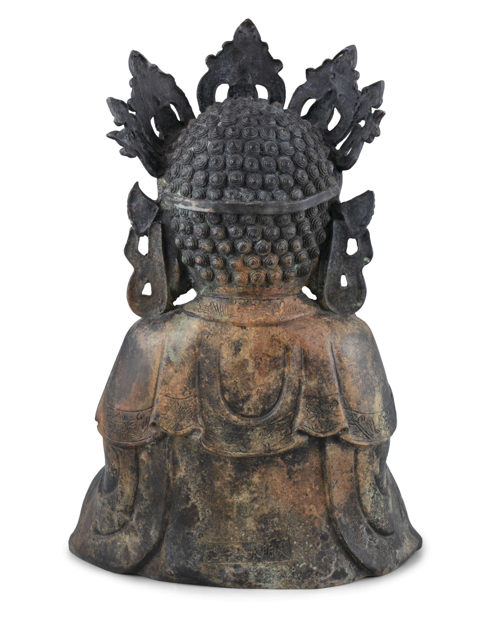 Heavy-casted, with no sealed plaque to the base, with a dark patina and gilt lacquer remains. The Buddha is...