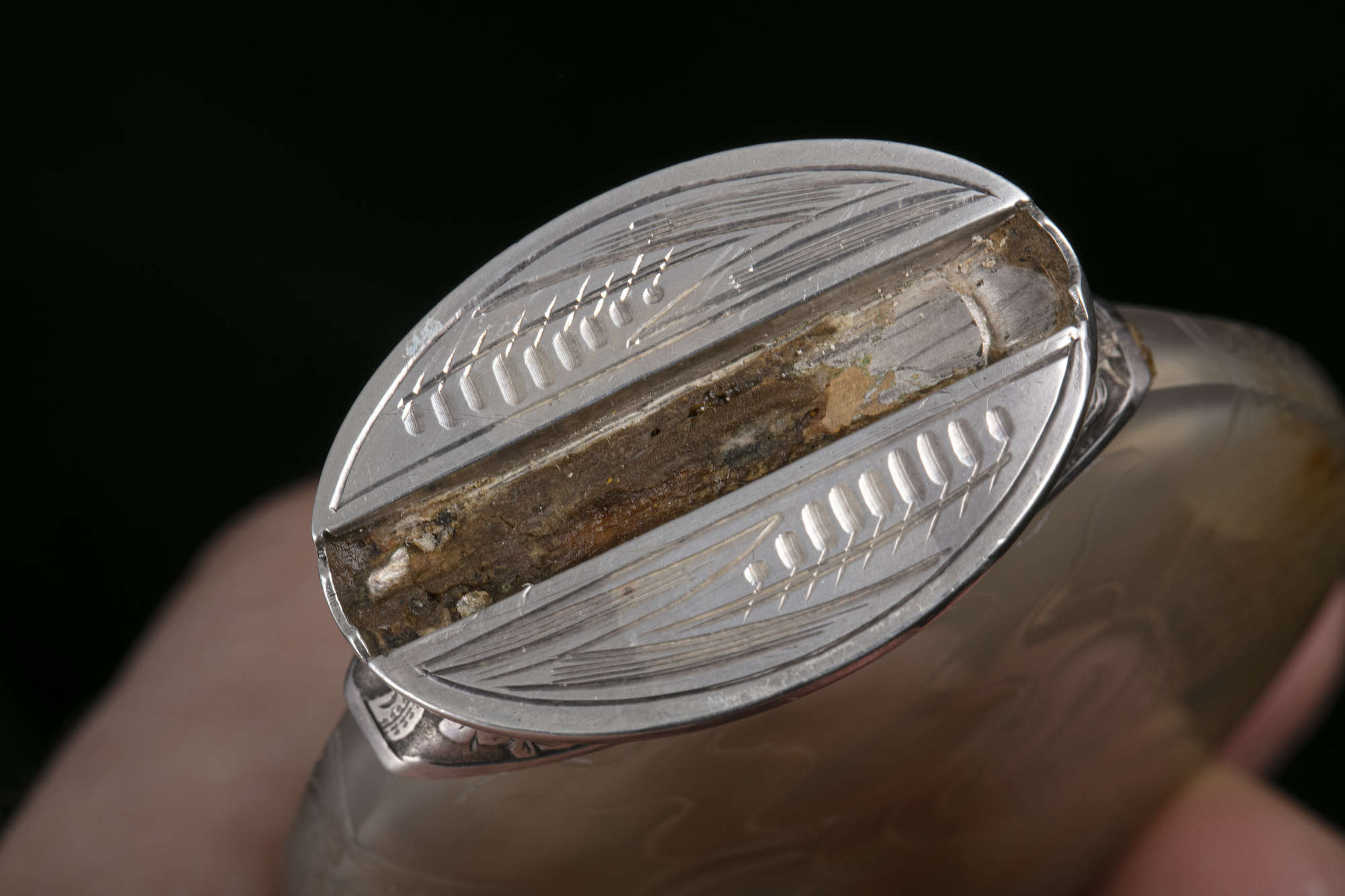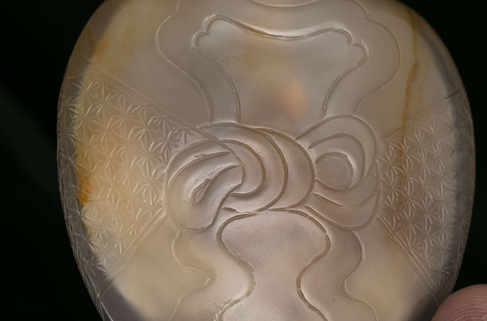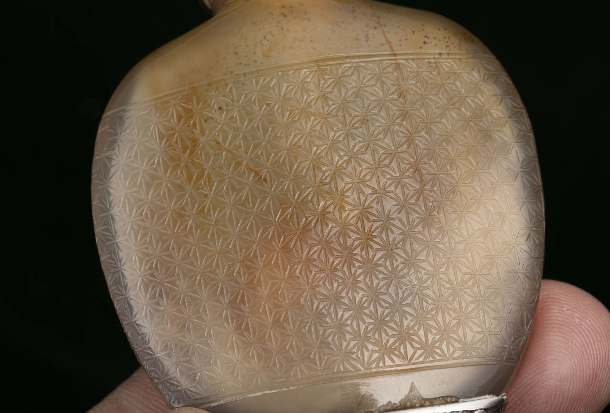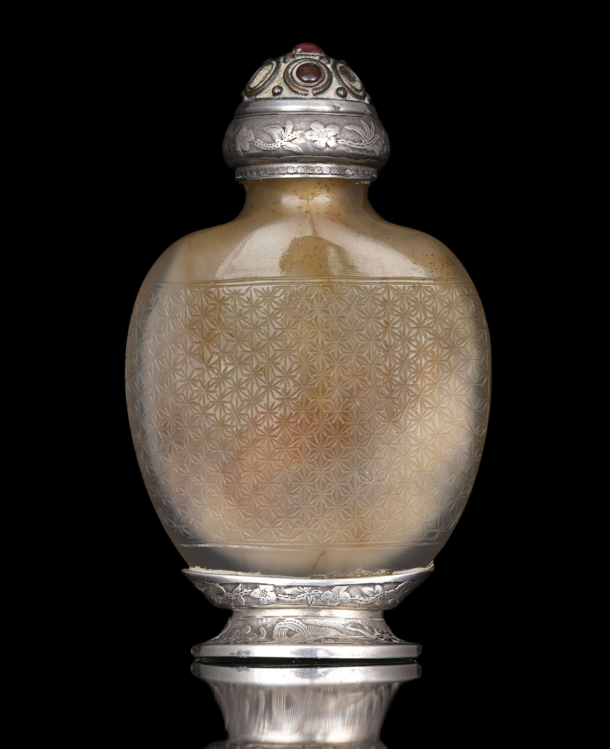 The agate snuff bottle with a flatted egg-shaped body and with brown inclusions is carved in lower relief with a fan and a woven pattern. It has been silver-mounted on a spread foot chiseled with flowers. The rim is also lined with silver and it is combined with a silver stopper embellished with stones. The rim bears the mark ‘Maquet’.