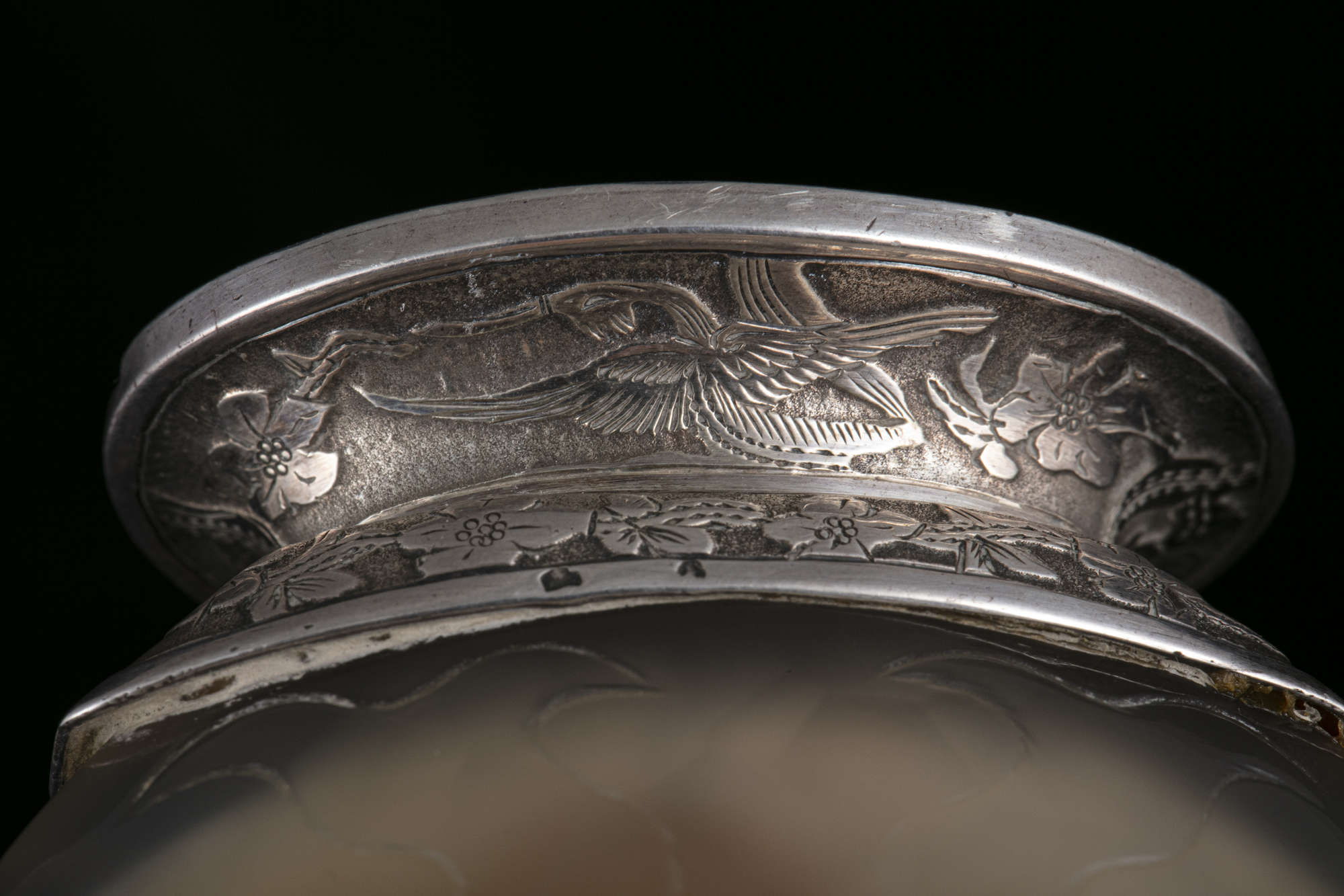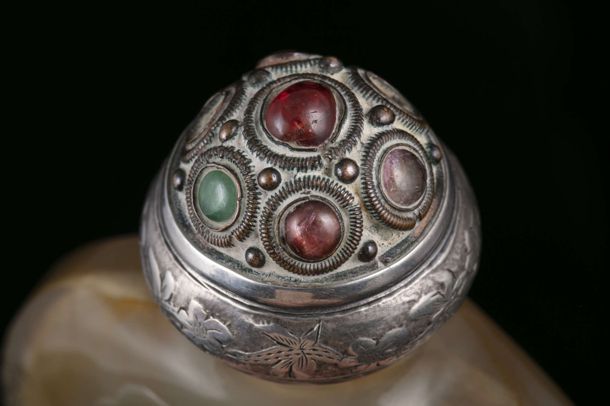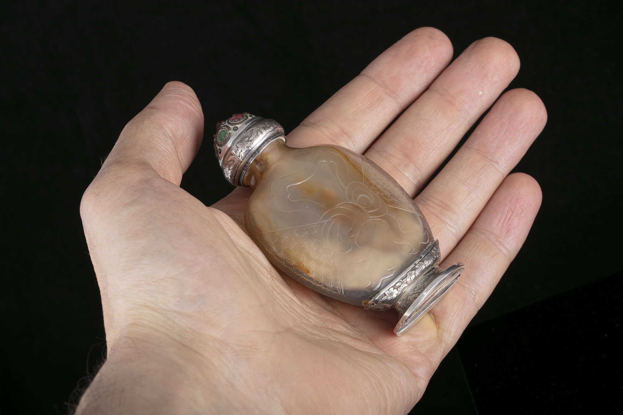 A SILVER-MOUNTED AGATE SNUFF BOTTLE MODIFIED AS A FRICTION LIGHTER