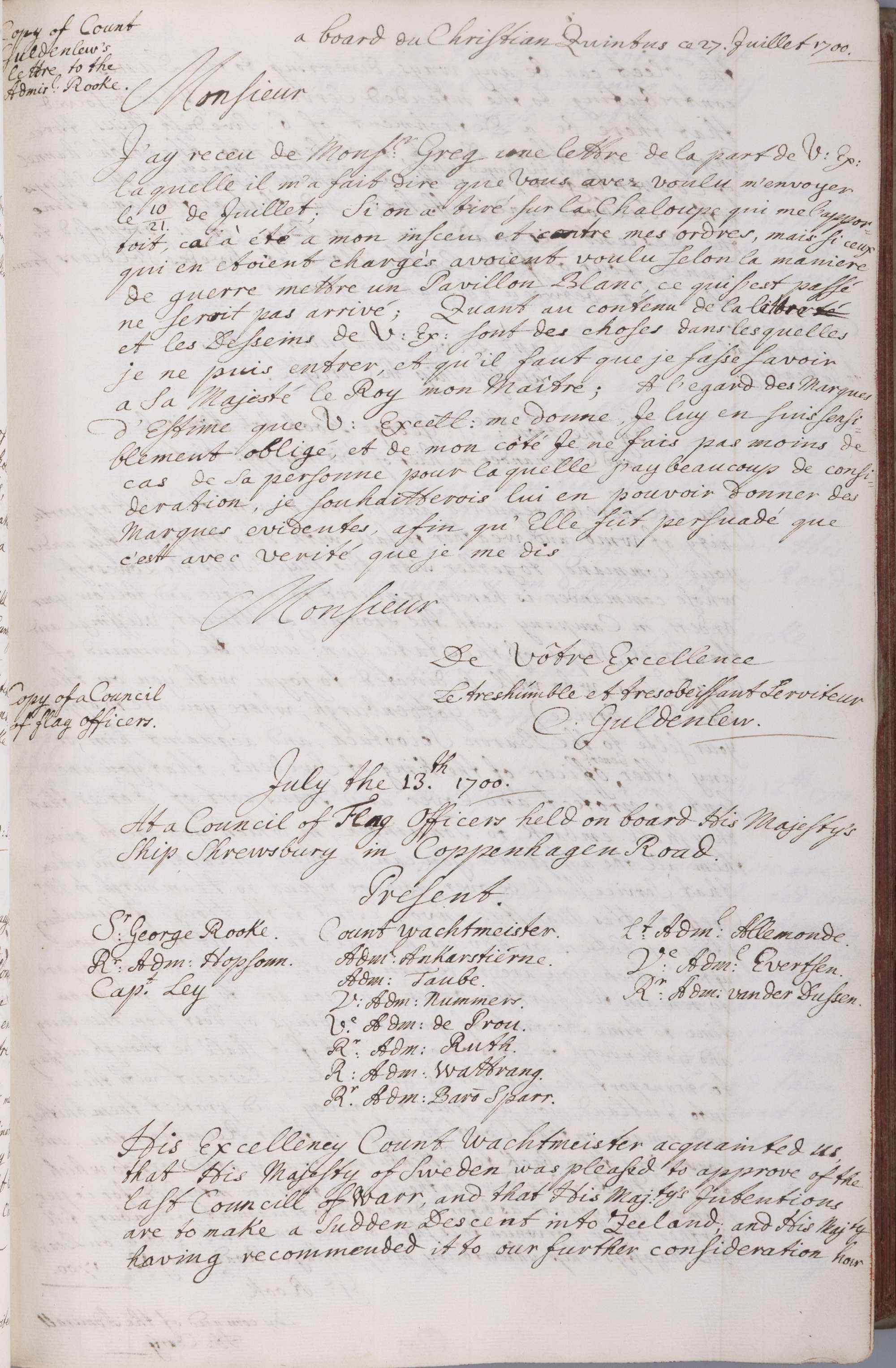 - Copies of the Council of Flag officers on board his majesty ship Shrewsbury in Copenhagen Road July 1700 -