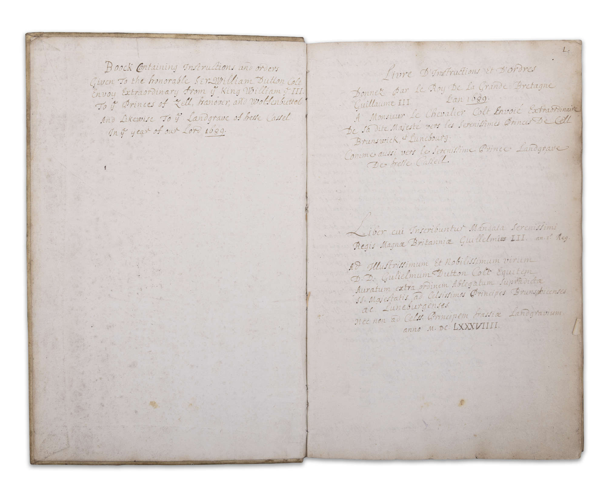 Inside page with inscription 'Book containing instructions and orders given to the Honorable Sir William Dutton Colt. Envoy extraordinary from King William III to Princes of Zell (Celle sic), Hanover and Wolftenbuttel and likewise to Landgrave of Hesse Cassel in the year of our Lord 1689' - this is transcribed again in French and Latin.