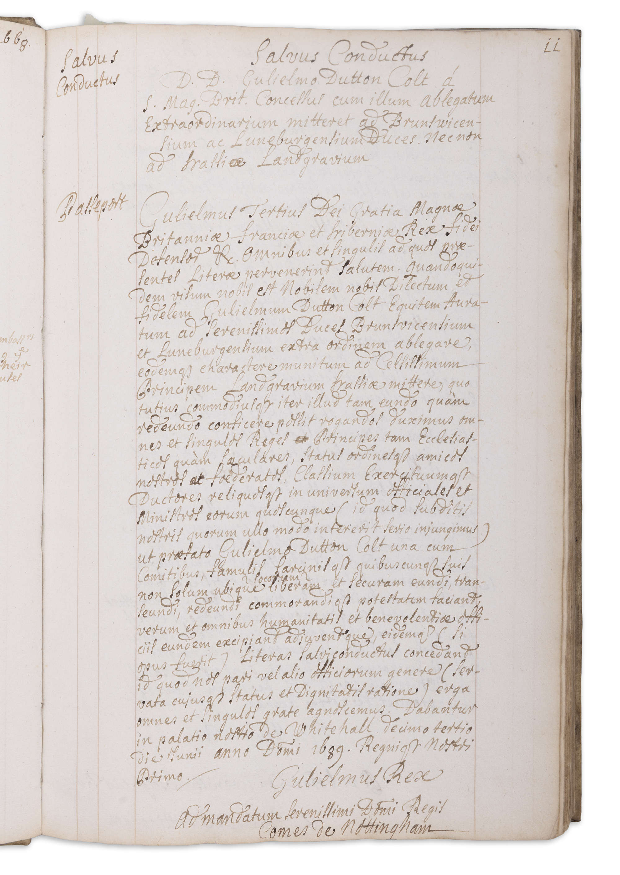 Colt was dispatched to the courts of Hanover, Celle, Wolfenbüttel, and Hesse-Cassel at a critical moment — 1689 was the year William III acceded to the English throne and immediately began building the Grand Alliance against Louis XIV of France. Colt’s mission was essentially to secure and maintain German princely support for William’s war effort. The ciphers noted in Book 1 are a strong indicator that these were live intelligence and negotiation documents, not merely ceremonial records. Many transcriptions are signed ‘Your most Humble Servant Nottingham’, which almost certainly relates to Tory politician and peer Daniel Finch, 2nd Earl of Nottingham (1647 - 1730), who served as Secretary of State (1689–1693 and again 1702–1704). This strongly suggests these volumes passed through, or were directed by, the office of the Secretary of State for the Northern Department, which had jurisdiction over diplomatic relations with precisely these German and Baltic states.