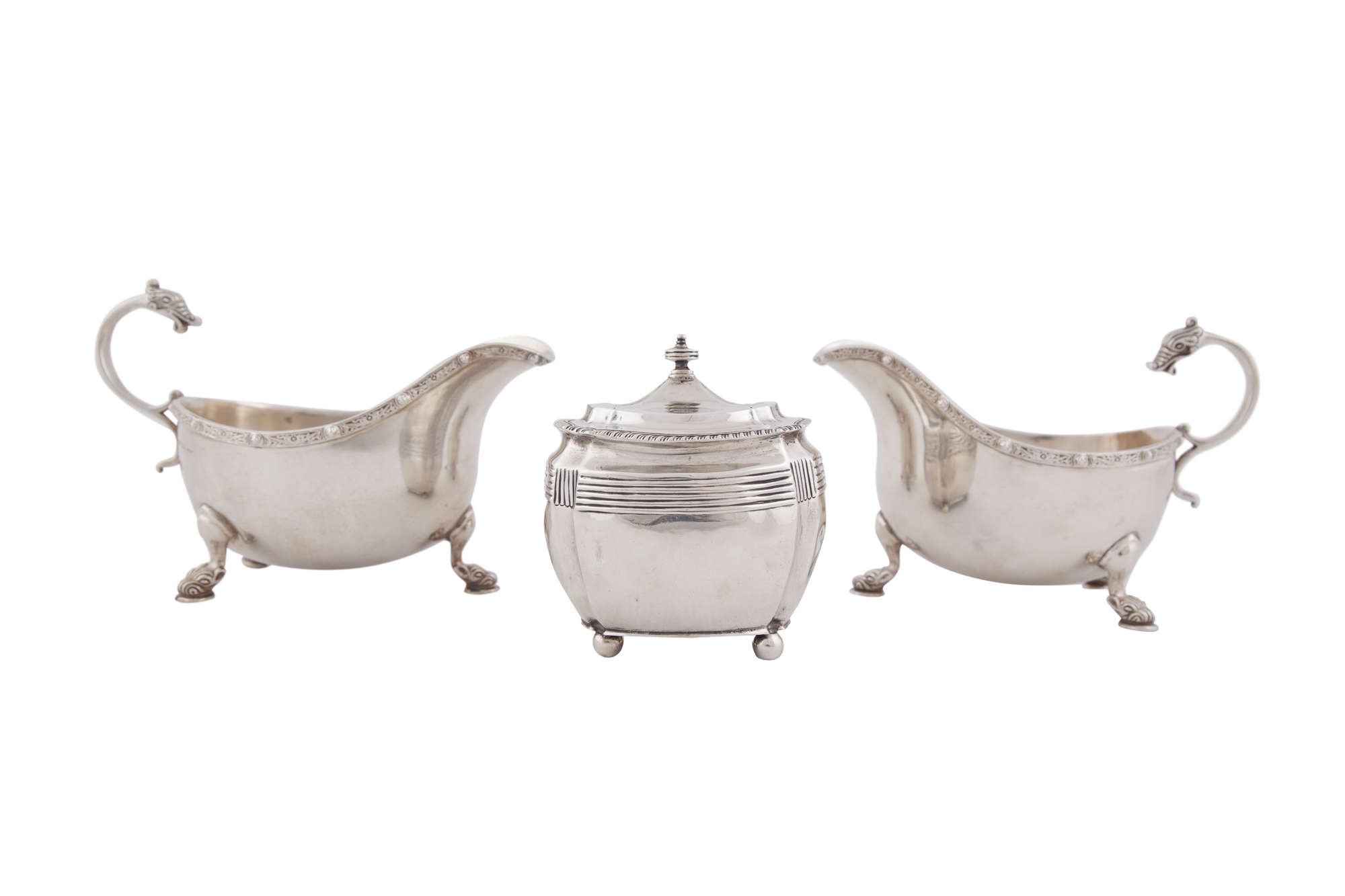 A PAIR OF SILVER CELTIC REVIVAL PATTERN SAUCE BOATS, Birmingham 1922, mark of Adie Brothers Ltd., Irish import marks, of shaped oval helmet form, with applied 's' scroll serpent head handles and Celtic pattern banding to rim, raised on three grotesque mask feet; together with a Victorian silver sugar bowl, London 1895, mark of Charles Stuart Harris, with hinged lid, (c.964g). (3)