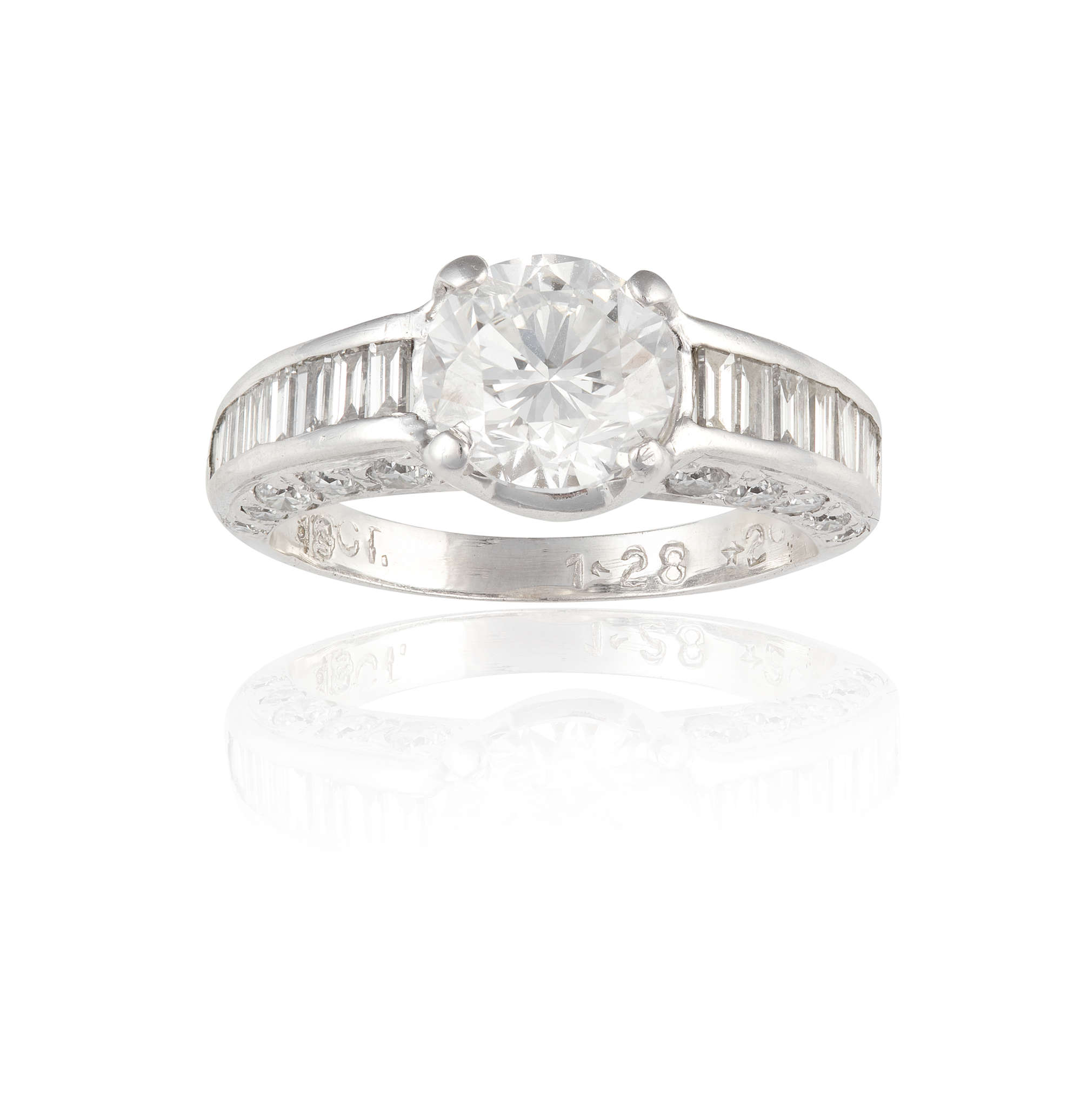 The round brilliant-cut diamond, within a four-claw setting, weighing approximately 2.00cts, between three rows of graduating round and baguette-cut diamond shoulders, mounted in 18K gold, remaining diamonds approximately 1.28cts, ring size M