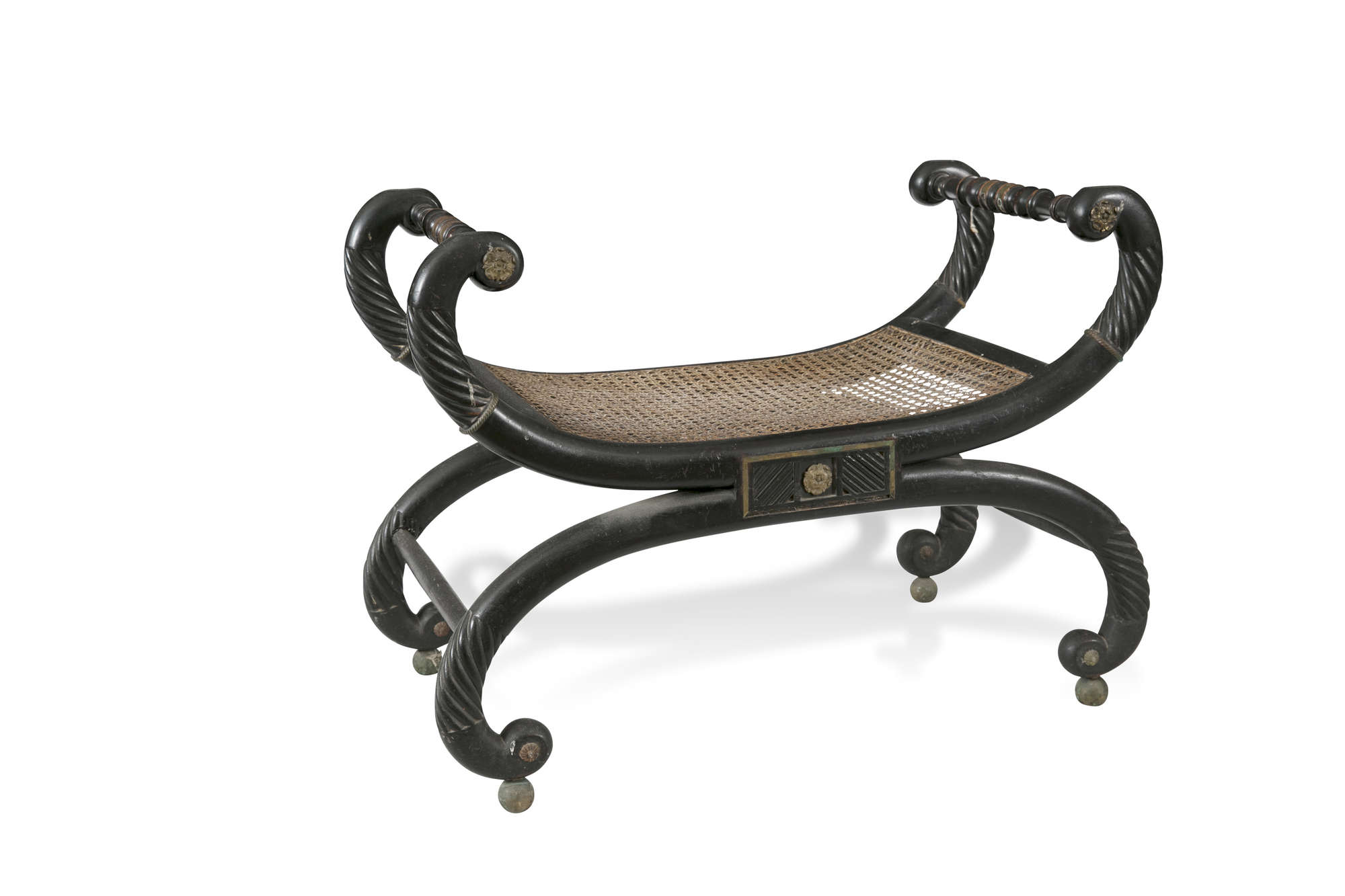 AN EBONISED WINDOW SEAT, c.1810, with scroll-over arms and turned brass bound roundels, cane seat, on conforming legs. 77cm wide