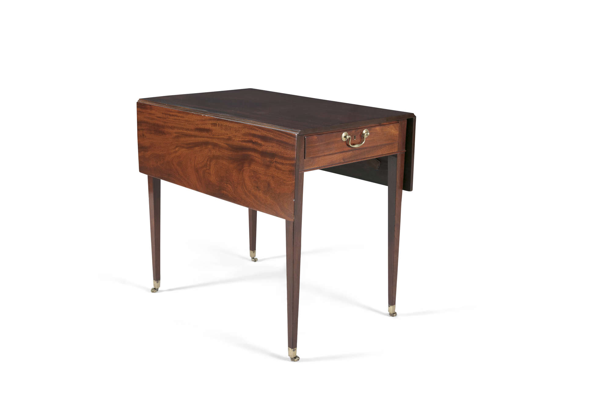 A GEORGE III MAHOGANY PEMBROKE TABLE, of compact rectangular form, with drop leaf sides and single frieze drawer, opposing dummy drawer, on squared tapering legs and brass barrel castors. 81cm...