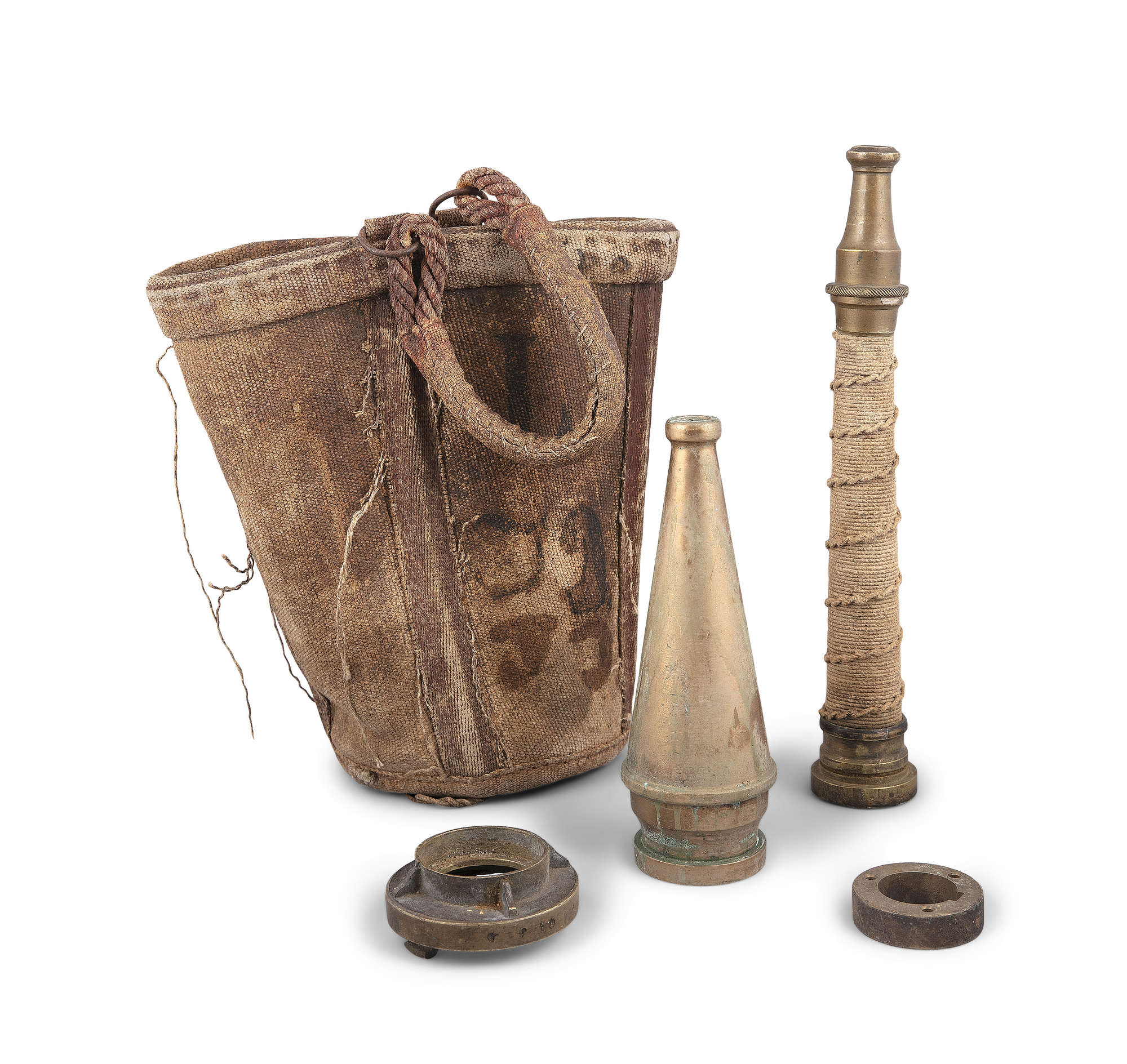 AN 18TH/19TH CENTURY CANVAS FIRE BUCKET, together with an assortment of brass hose nozzles and attachments