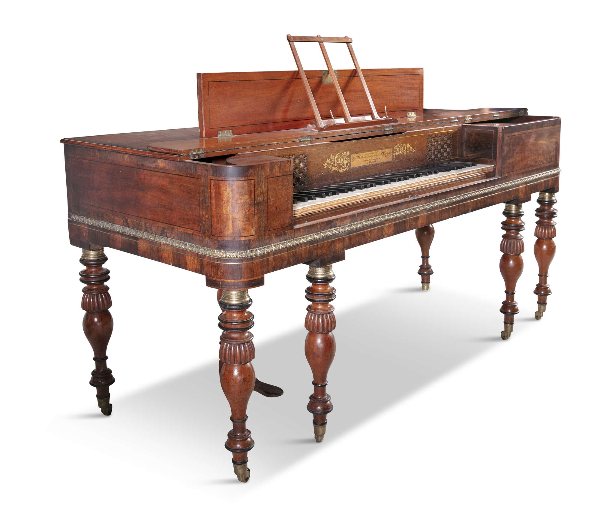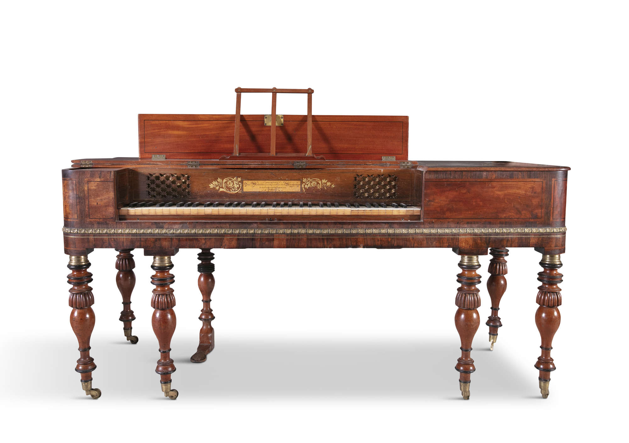 AN IRISH GEORGE III SQUARE PIANO BY SAMUEL MORELAND, of 63 Mecklenburgh Street Lower, the case decorated with crossbanding, ebon stringing and applied brass mounts, opening to an ivory keyboard with panel inscription "Improved patent Sam Moreland Grand and Square piano forte Manufacturer, 63 Lower Mecklenburgh Street, Dublin" with hand-painted gilt scroll and foliate decoration to each side, raised on ring turned baluster supports and brass castors. 174cm wide, 70cm deep, 82cm