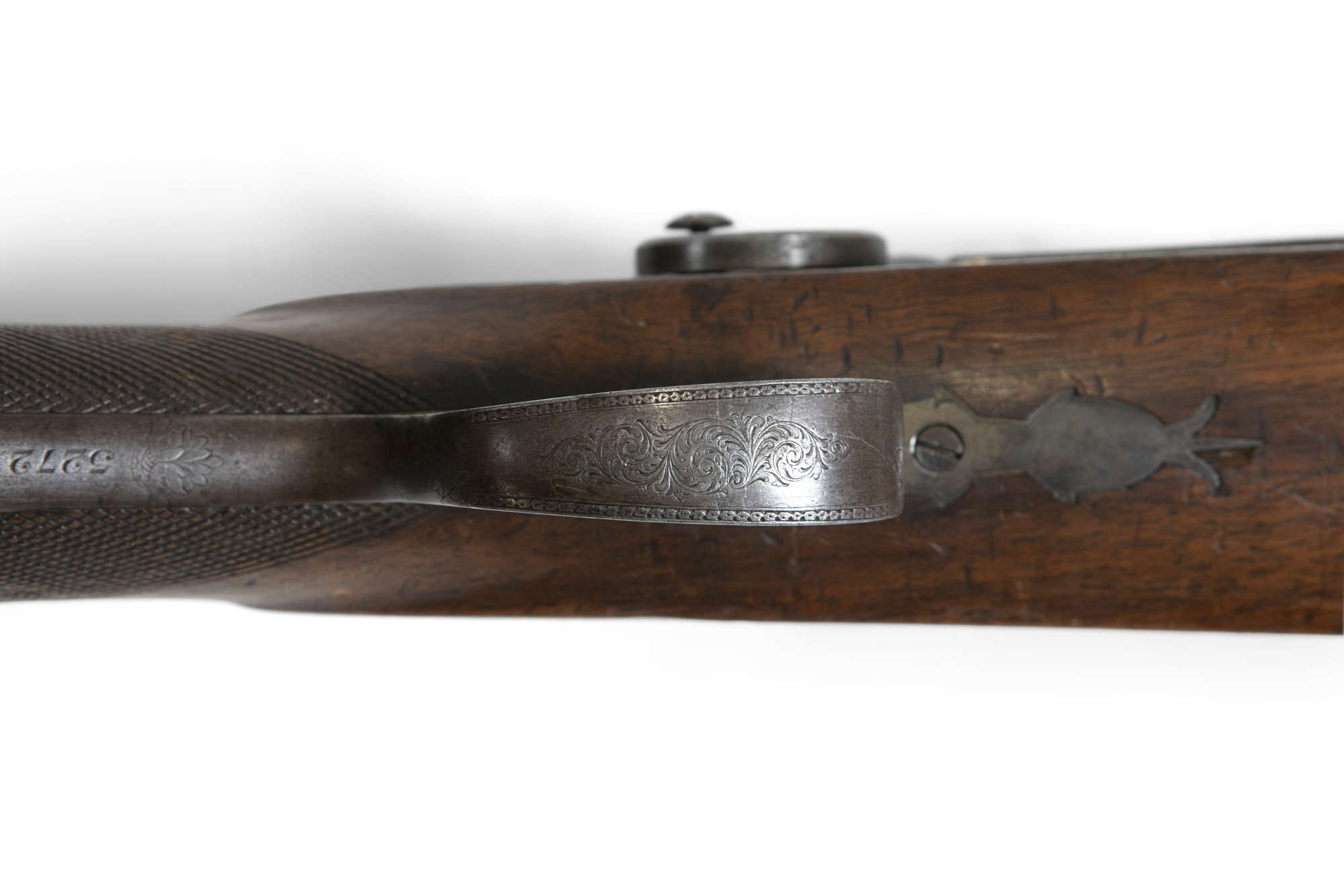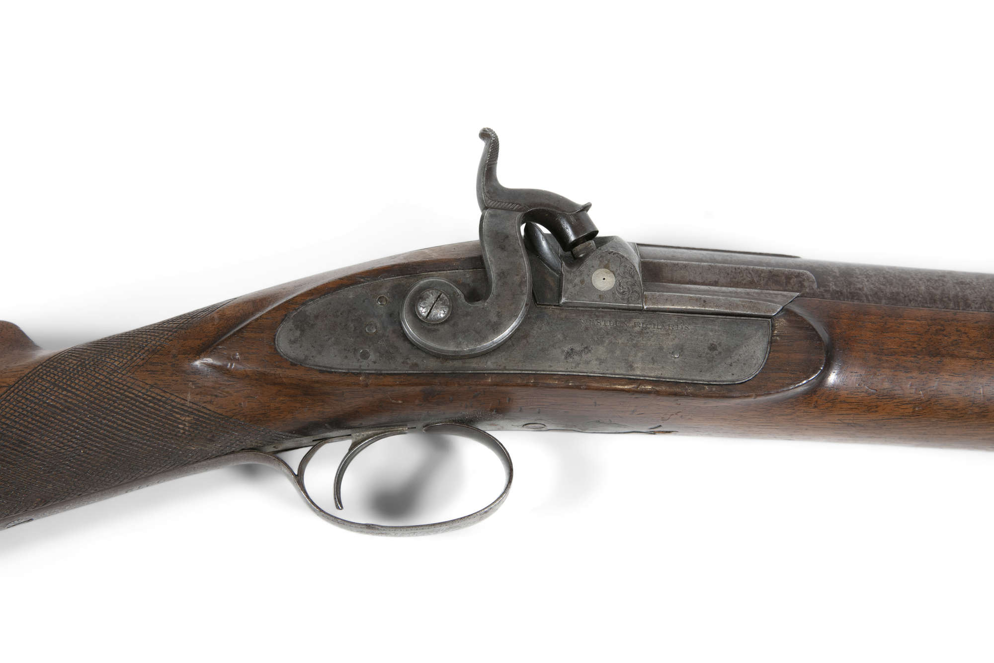 A 19TH CENTURY PERCUSSION LARGE BONE MUSKET BY WESTLEY RICHARDS, with Damascus barrel with walnut stock and ebon ramrod. 144cm overall