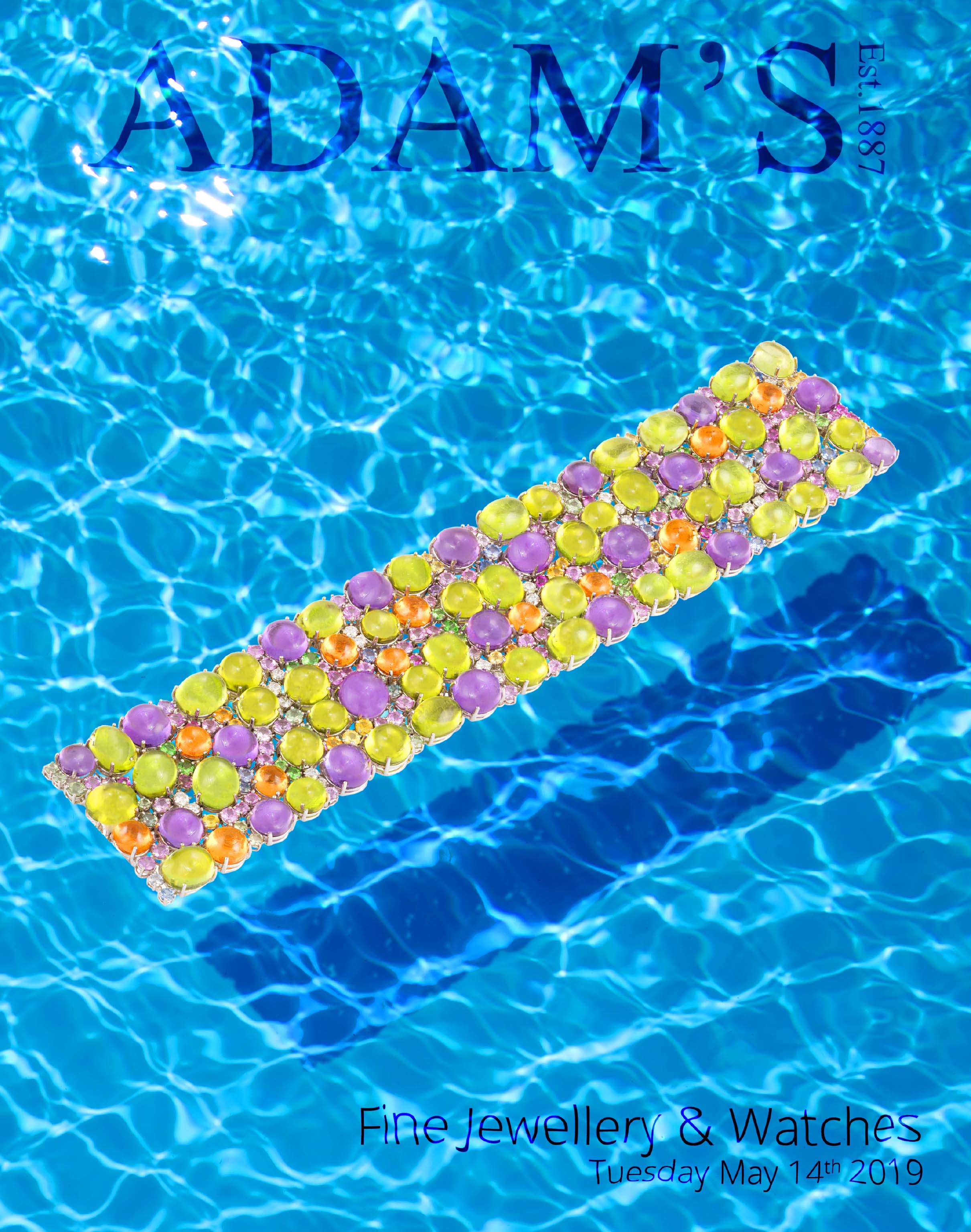 Each designed as an articulated row of vari-cut gemstones including an amethyst, a blue...
