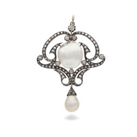 A 9 carat gold pendant of a bird, the enamelled colourful bird motif set with a split baroque pearl within a circular openwork surround,...
