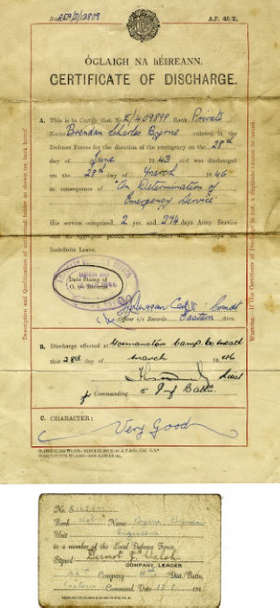 Oglaigh na hEireann (Irish Army). A Certificate of discharge issued to Brendan Charles Byrne, 28 March 1946, printed official document with insertions, signed and stamped, with a Local Defence...