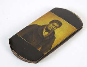 A 19th Century leather and papier- mache spectacle case of rectangular form. The papier mache front panel printed and parcel gilt with a half length portrait of Daniel O'Connell.