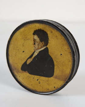 A 19th Century papier-mache snuff box of circular form. The lid hand painted with a half-length portrait of Daniel O'Connell against a gilt background.