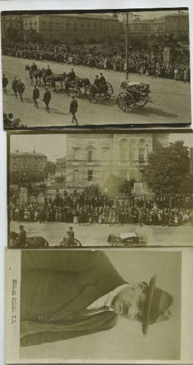 Six unused postcards; two half length portrait cards and four depicting his funeral. Some very rare cards. (6)
