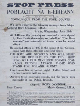 Stop Press - Poblacht na h-EireannO'Connor (Rory) "Communique from the Four Courts." "9 a.m. Wednesday, June 28 [1922]" "At 3.40 a.m. this morning we received a note...