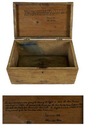A wooden box with hinged lid, approx. 15 x 9 x 7 ½ ins, with inked...