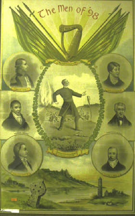 1798: The Men of '98, a large and attractive coloured poster showing medallion portraits etc, leaders of the Rebellion of 1798, published by John Arrigo, & printed by James Walker & Co. Jones...